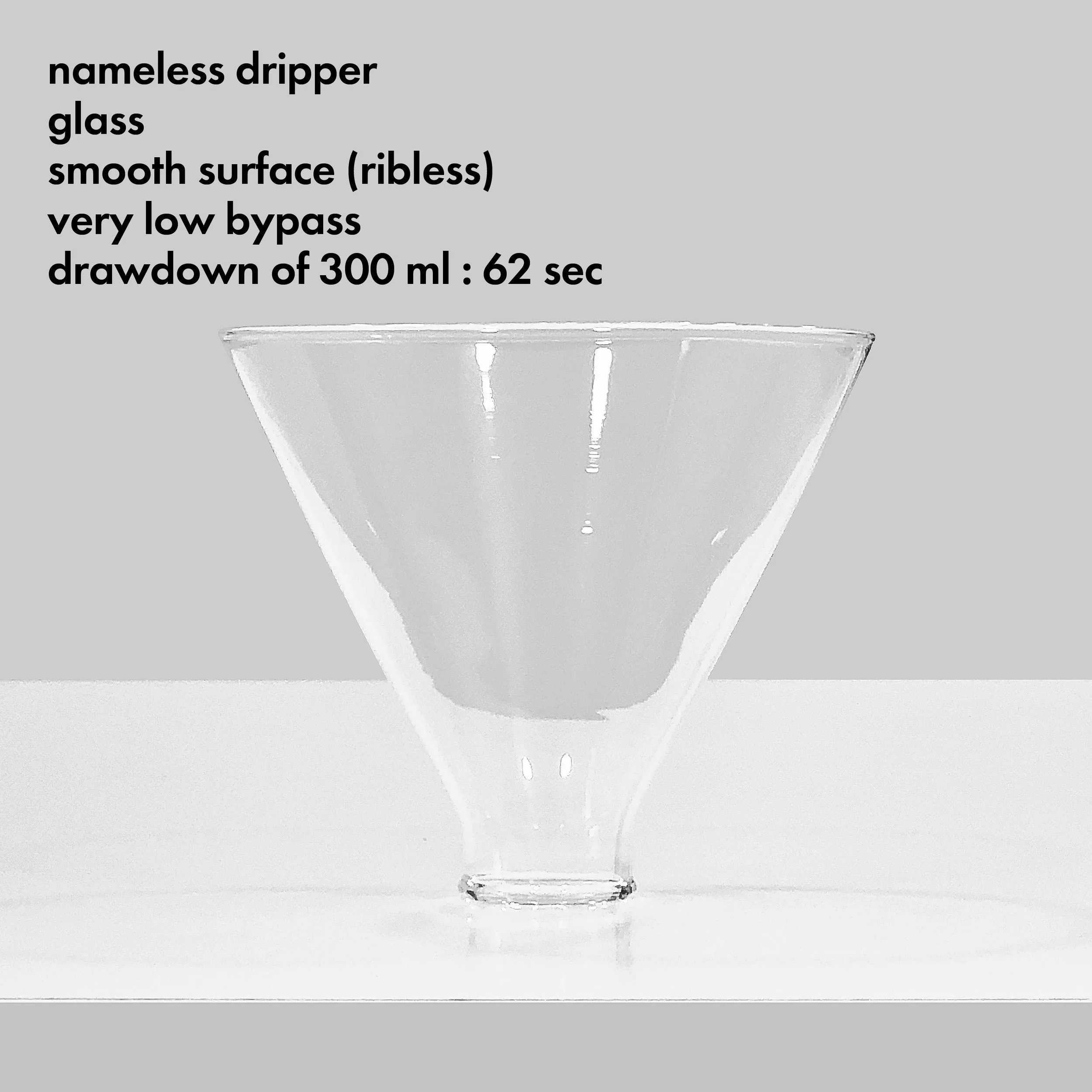 Image 3 and 4 : a nameless glass dripper purchased from Taobao (or Aliexpress to some countries) at rmb 50. It adopts a completely ribless approach that maximizes contact areas with filter paper. Bypass is kept at minimum while the drawdown is also significantly slower. I found it takes 3 times longer than Noi to drain same amount of water, and is unlikely to finish a 250 ml brew within 9 minutes. Nevertheless, I think it is a fun dripper to use if one can nail down the right grind size and pouring speed (just not so viable for daily use or cafes at the very least).
