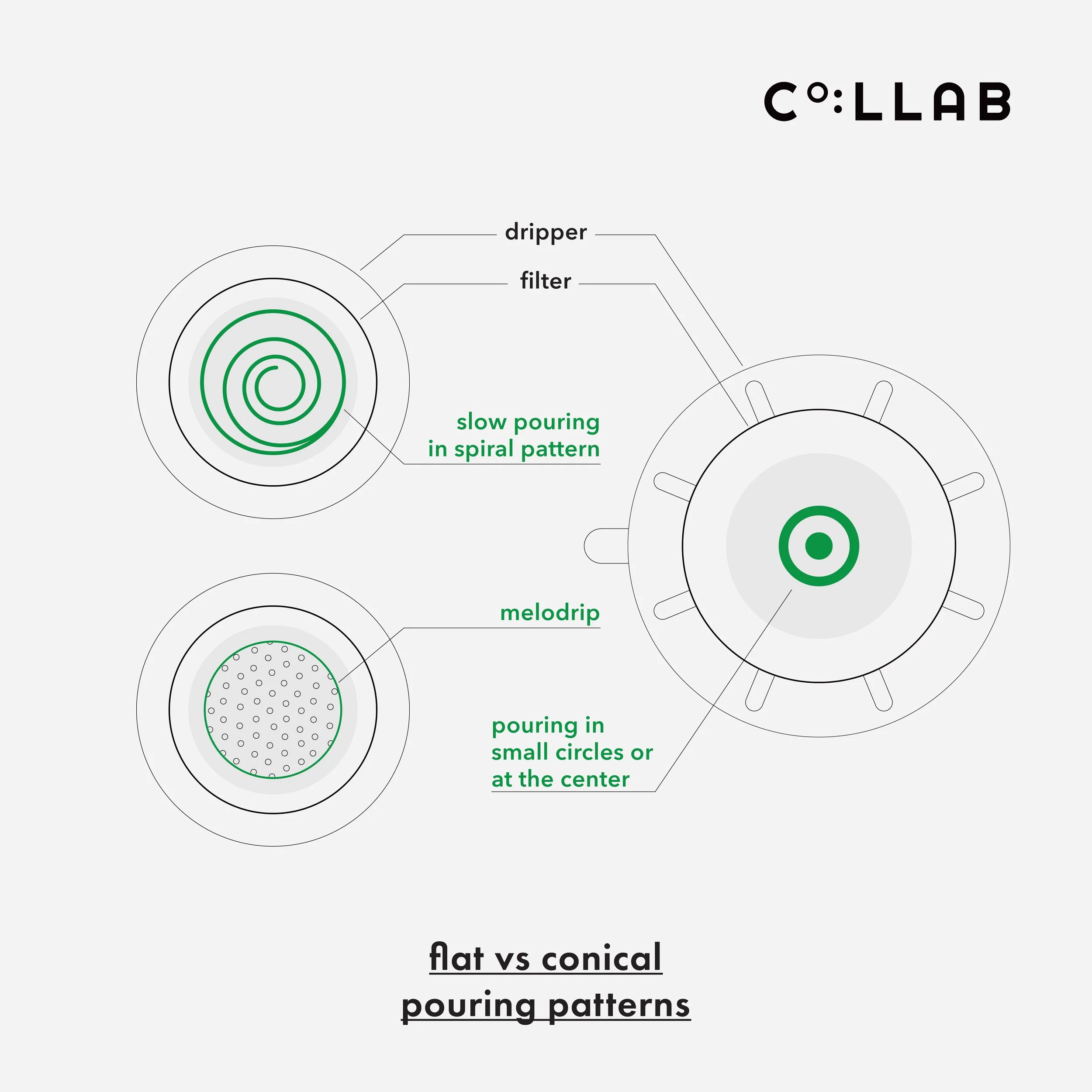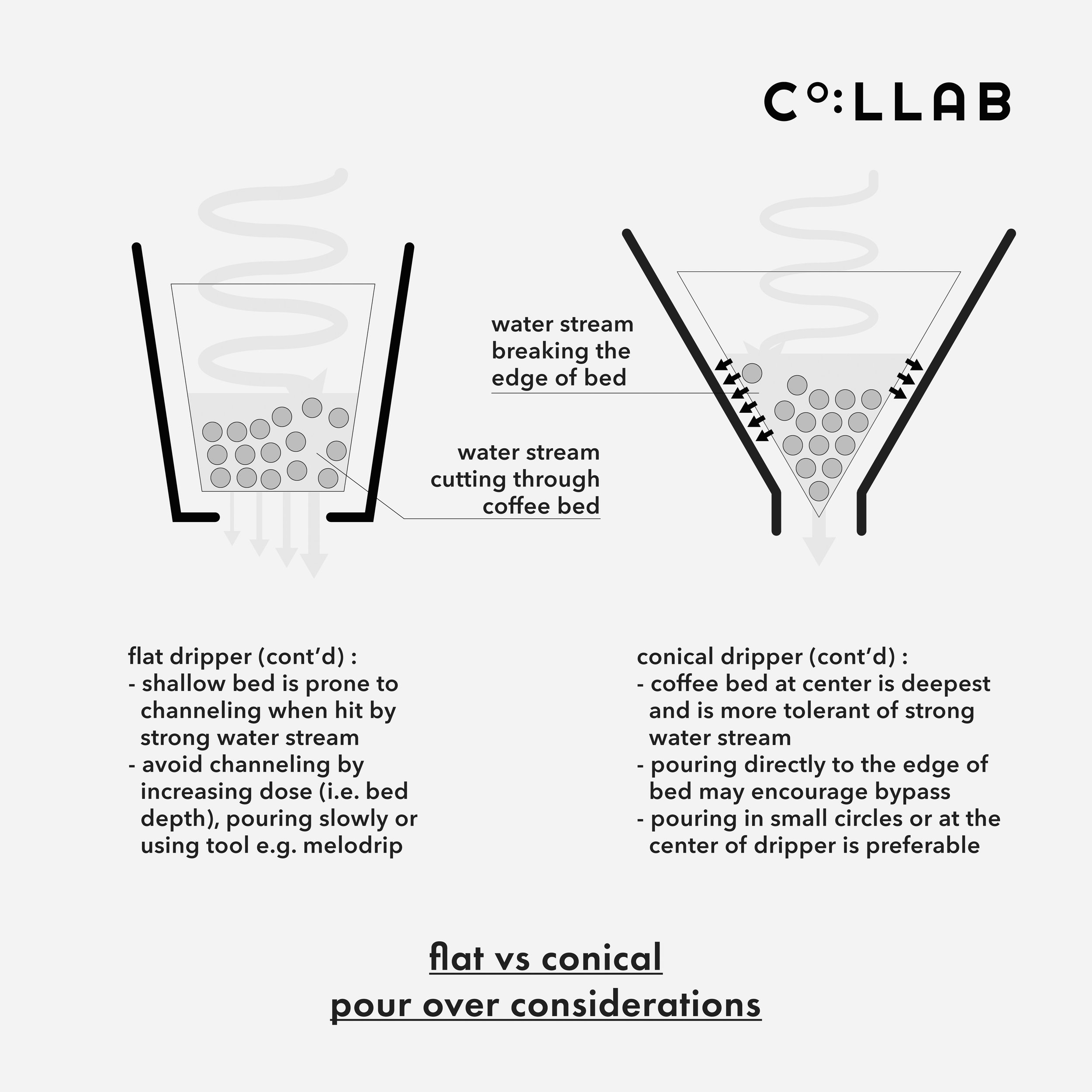 Therefore, flat dripper generally works better in large doses. Besides, slow pouring or tool-assisted pouring (e.g. melodrip) can minimize agitation thus less channeling risk. In comparison, conical benefits more from agitation as the bed center is the deepest. For conicals, you may consider pouring in small circles and avoid hitting the edge of coffee bed.