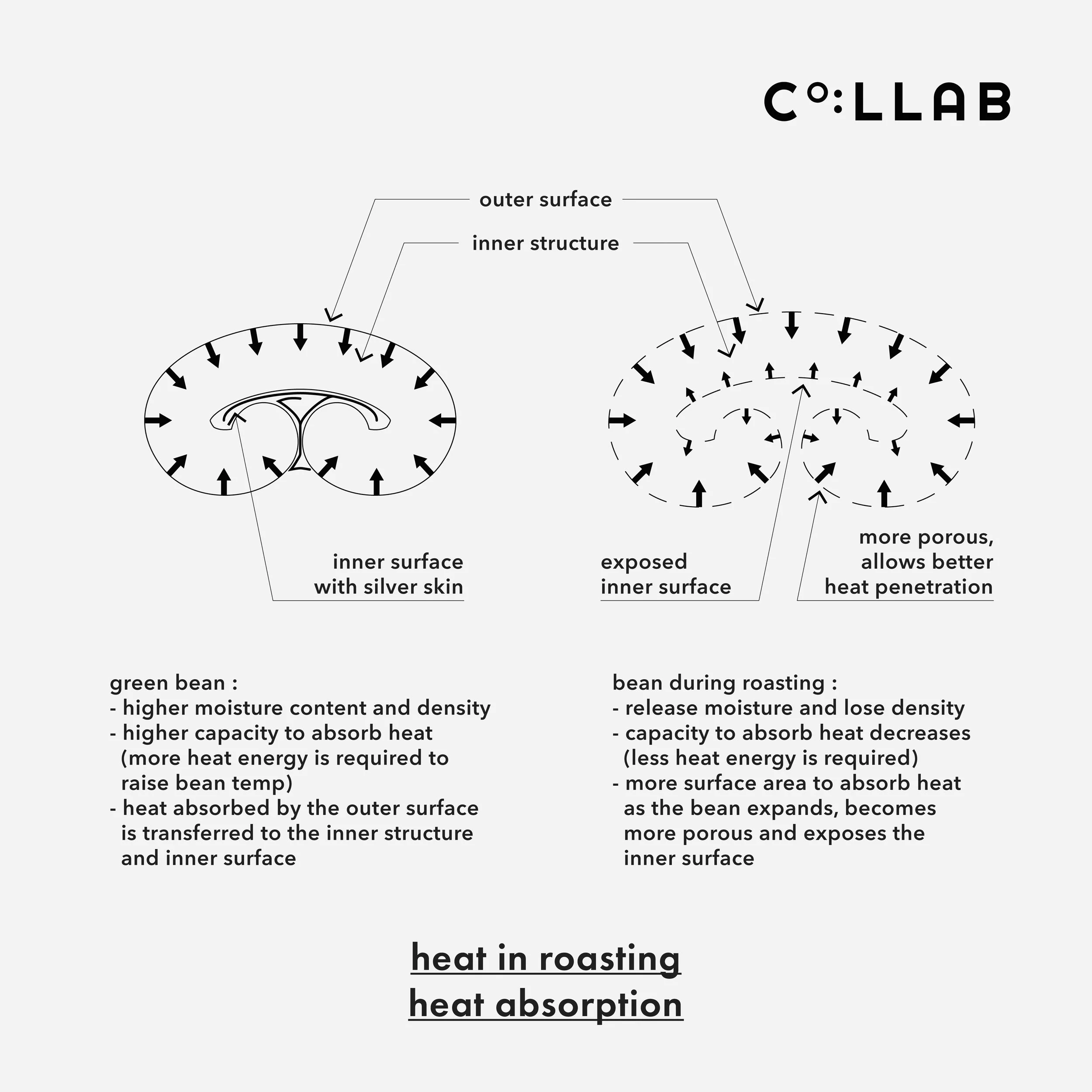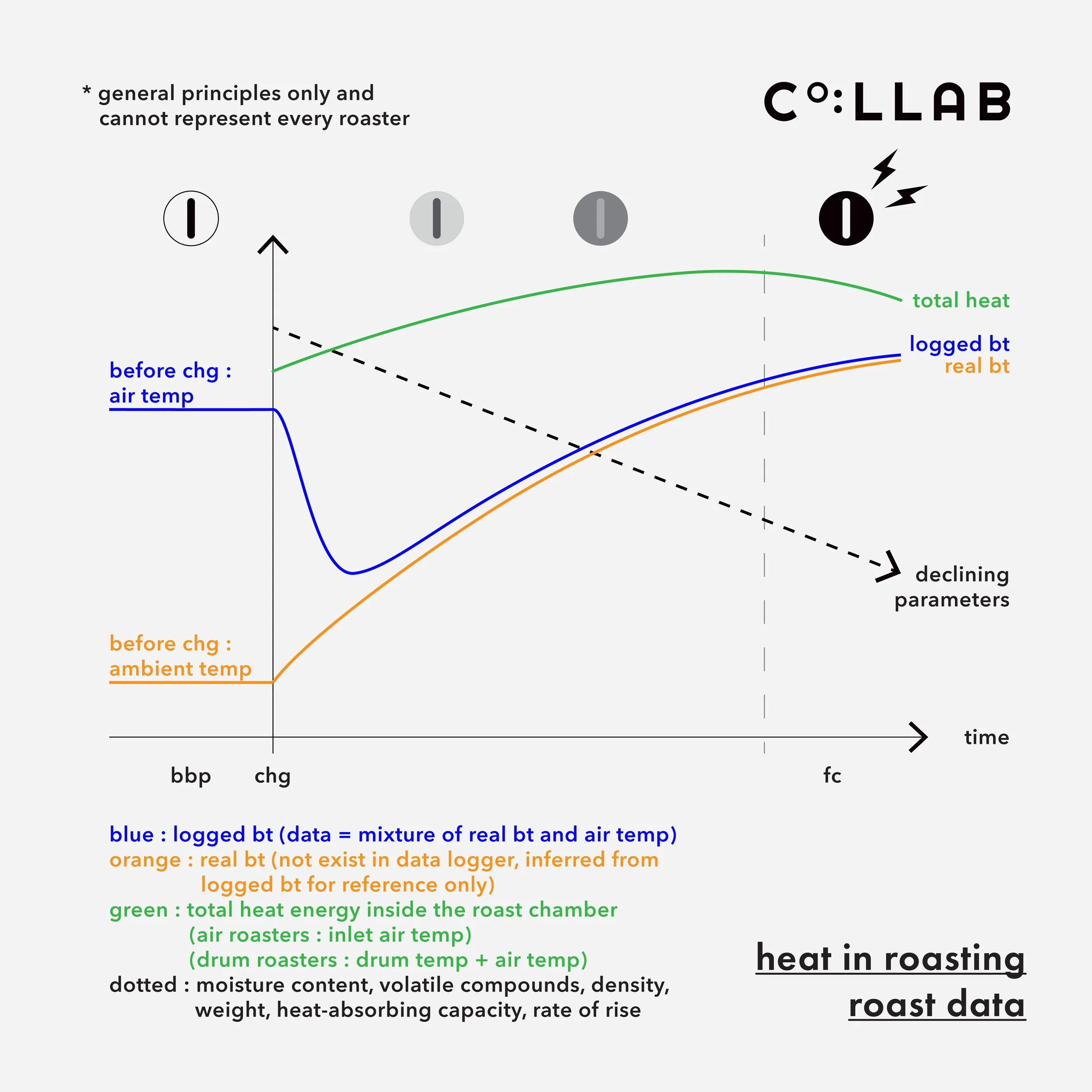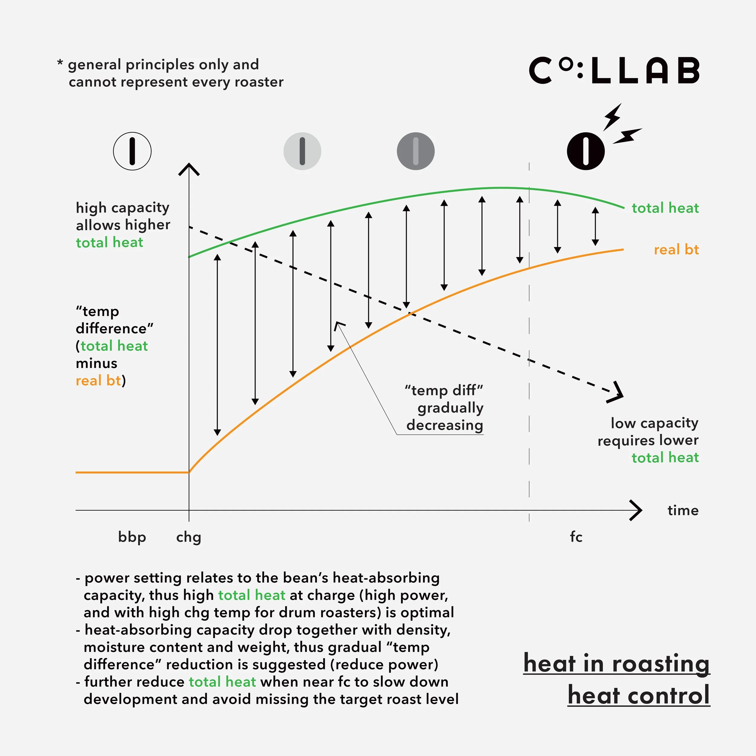 While everyone's roasting style may vary, we were all taught to charge a batch with high power then gradually reduce towards the first crack (fc). It is because green beans are dense, they are more capable of absorbing heat and transferring to the inner structure. Imagine heating a saucepan full of water: it requires more energy to raise the same temperature than an empty one. As the beans are heated, they expand, become porous and gradually lose moisture, density as well as the heat-absorbing capacity.