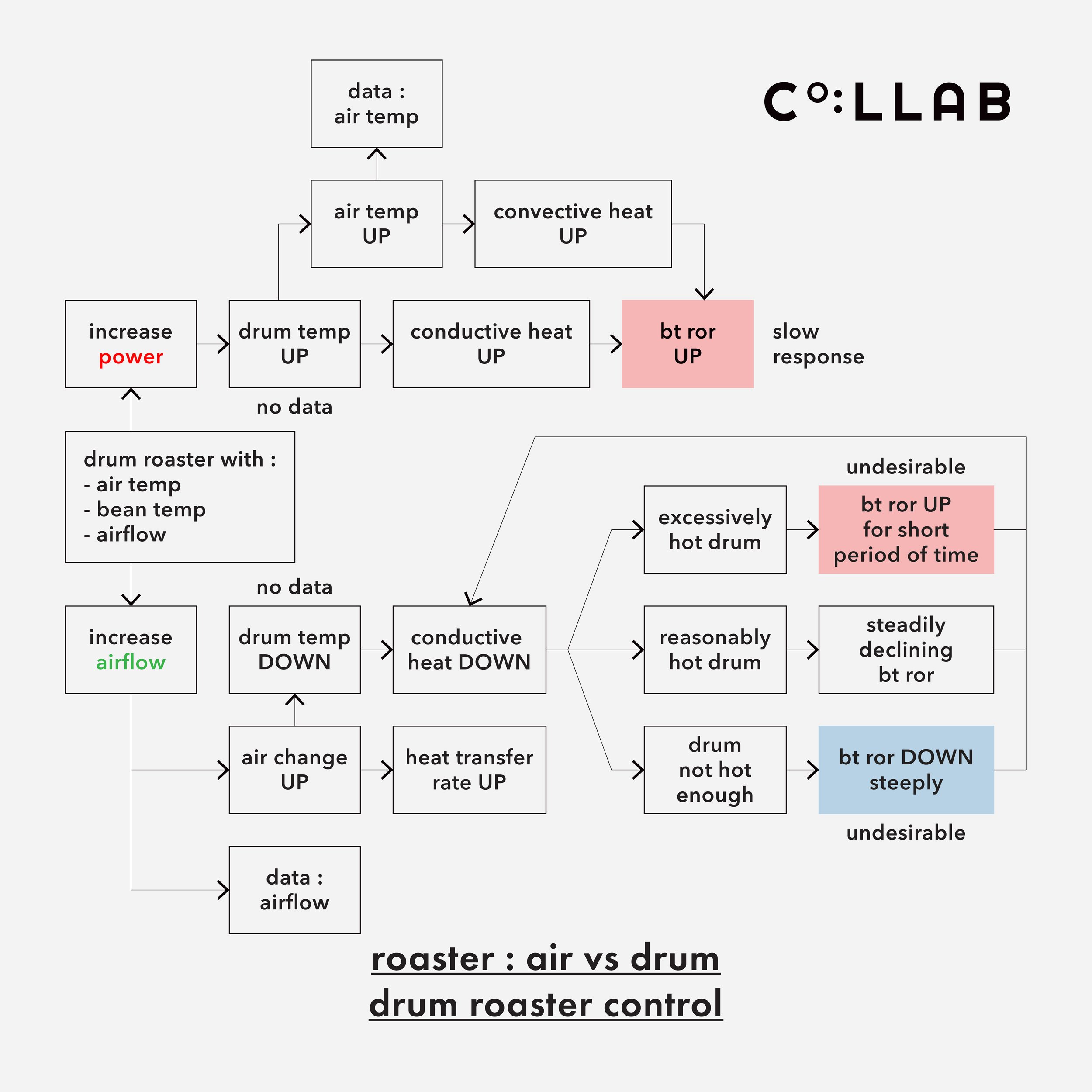 Besides, the drum's thermal lag can make heat control somewhat sluggish. As the drum needs to absorb or release heat before it has an effect on the air temp then the bt, it can take up to 20 seconds from adjusting power to seeing a change in the bt ror curve.