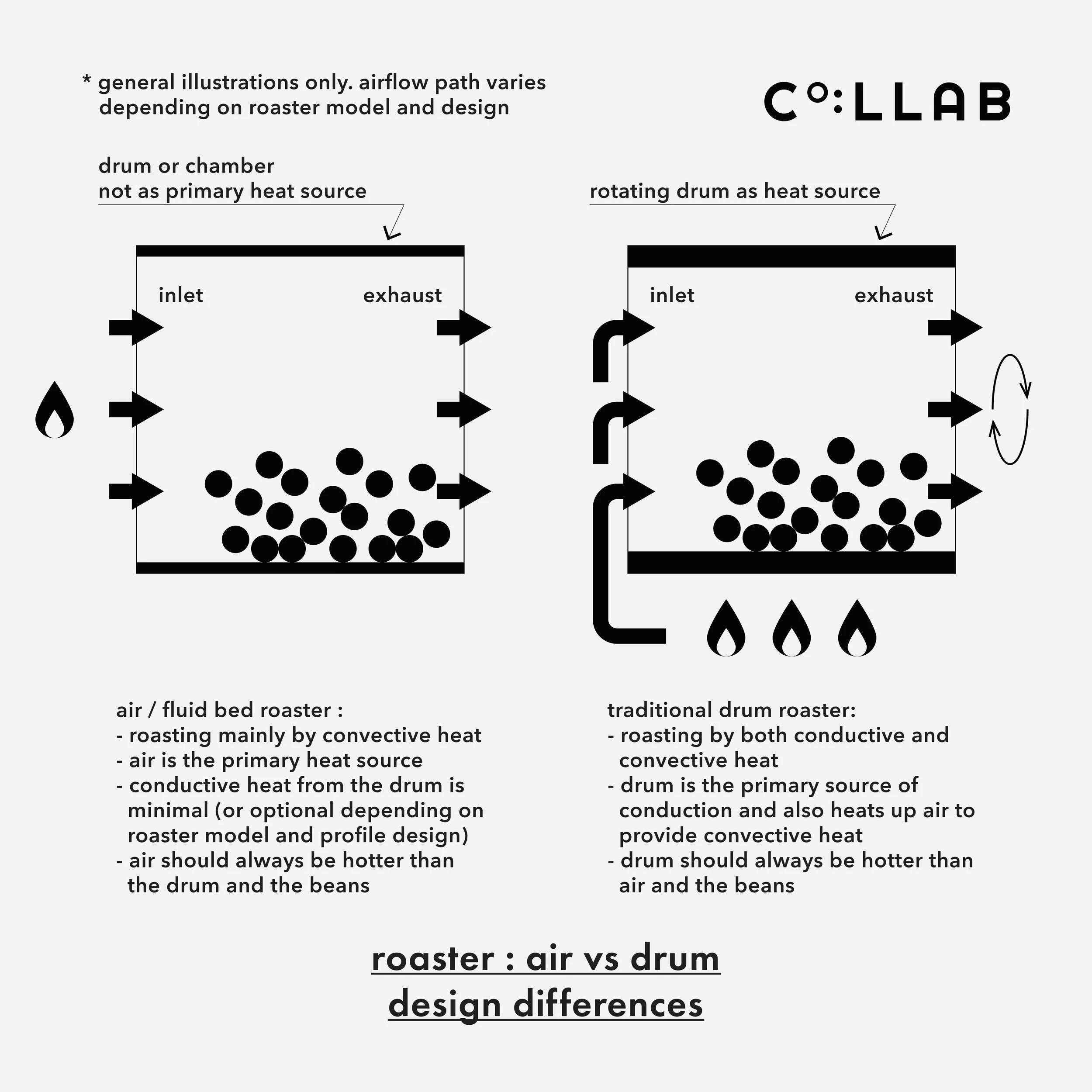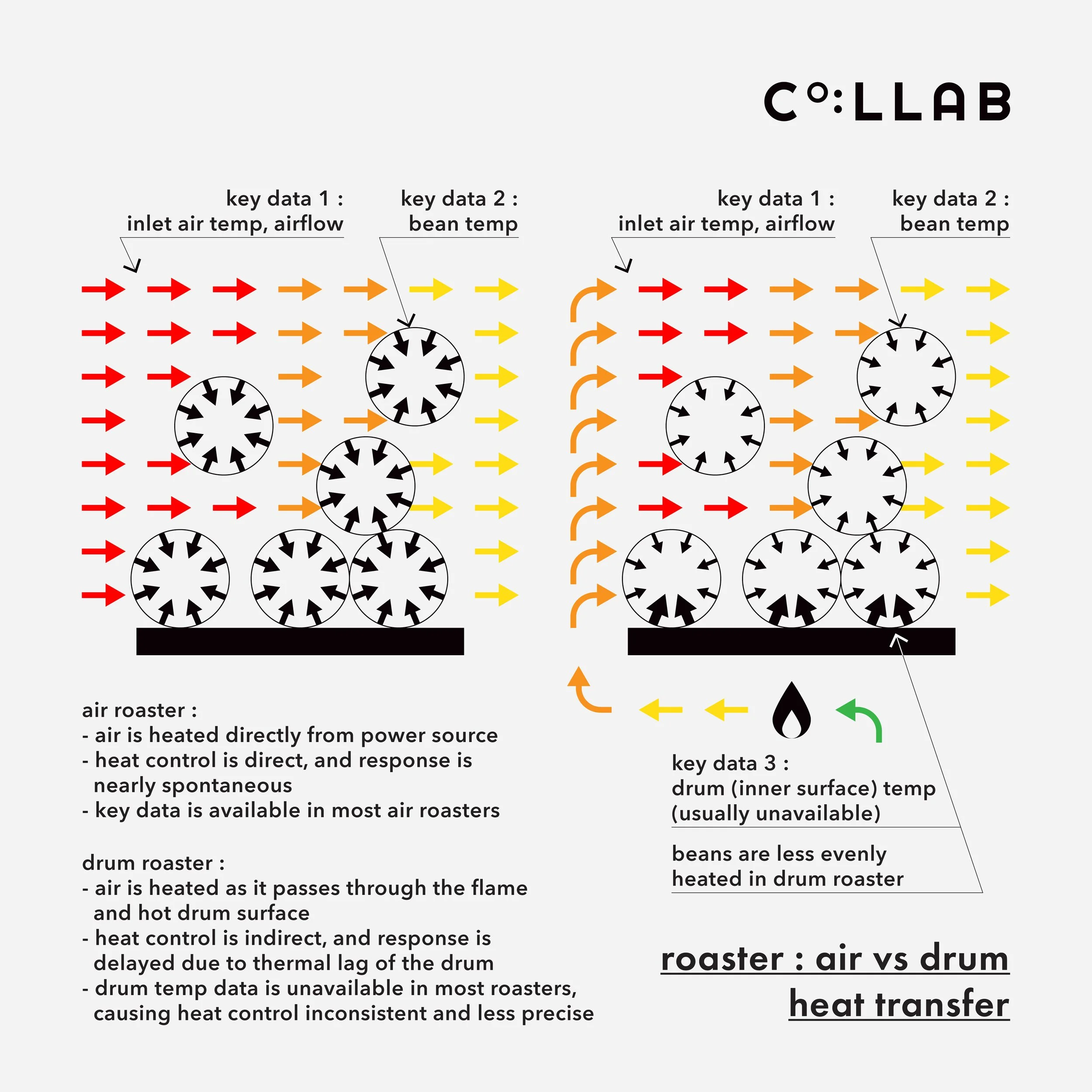 On the contrary, IR-1 is a traditional drum roaster with the drum being the primary source of energy. Please note that it does not equal "conductive heat being the primary source of energy" which is untrue. Convective heat still plays a major role while the drum acts as an energy source that heats up the air before it enters the chamber. In this regard, the drum should always be hotter than the air and the beans.