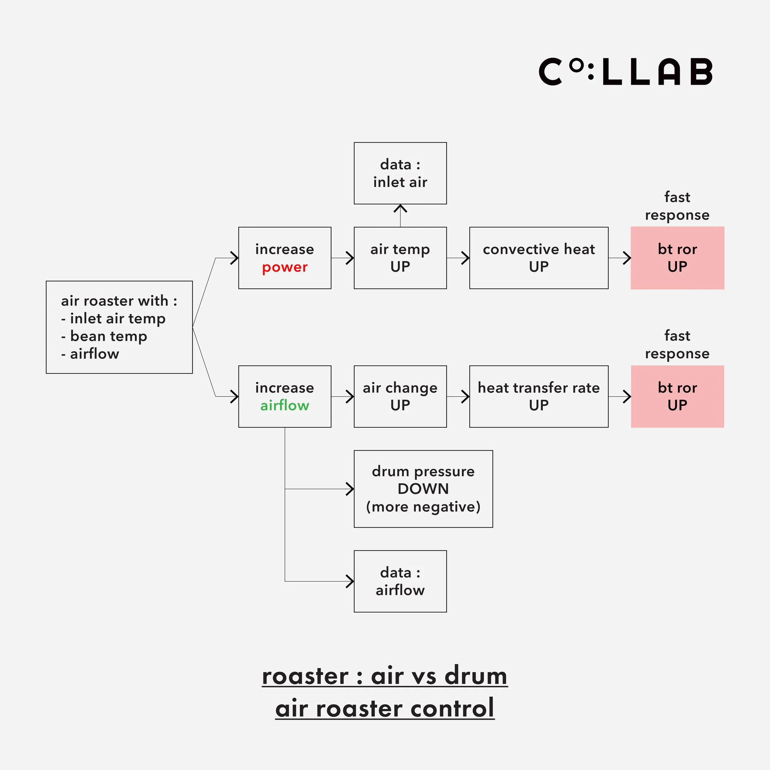 Another challenge in drum roaster is the impact of airflow change. Higher airflow results in more air drawing heat from the drum. At the expense of conductive heat, convective energy will increase for a period of time, then drop again as the drum cools down. Therefore, we were all taught to adjust airflow always at the same bt or time to maintain a steadily declining bt ror, and strictly follow warmup and between-batch protocols to ensure the drum's thermal mass is reset consistently.