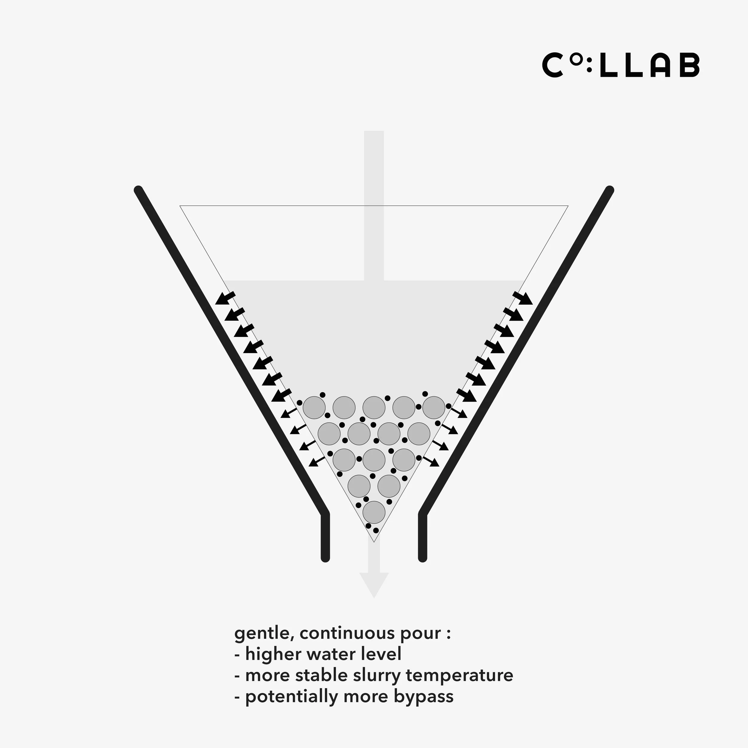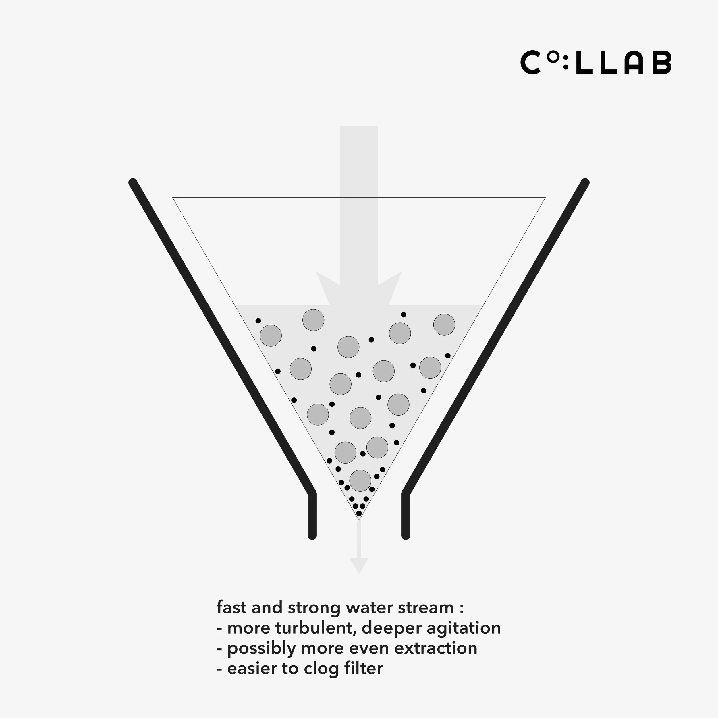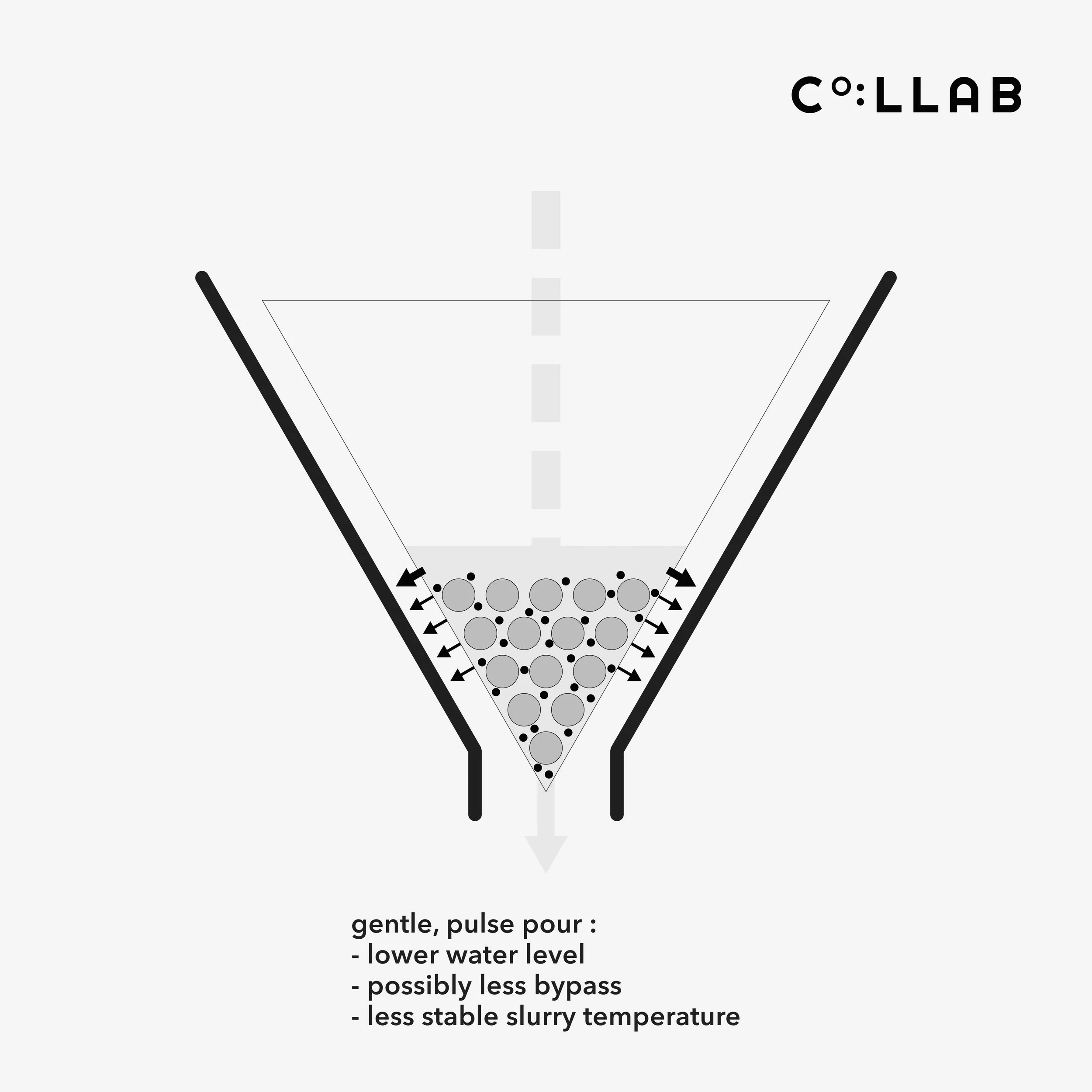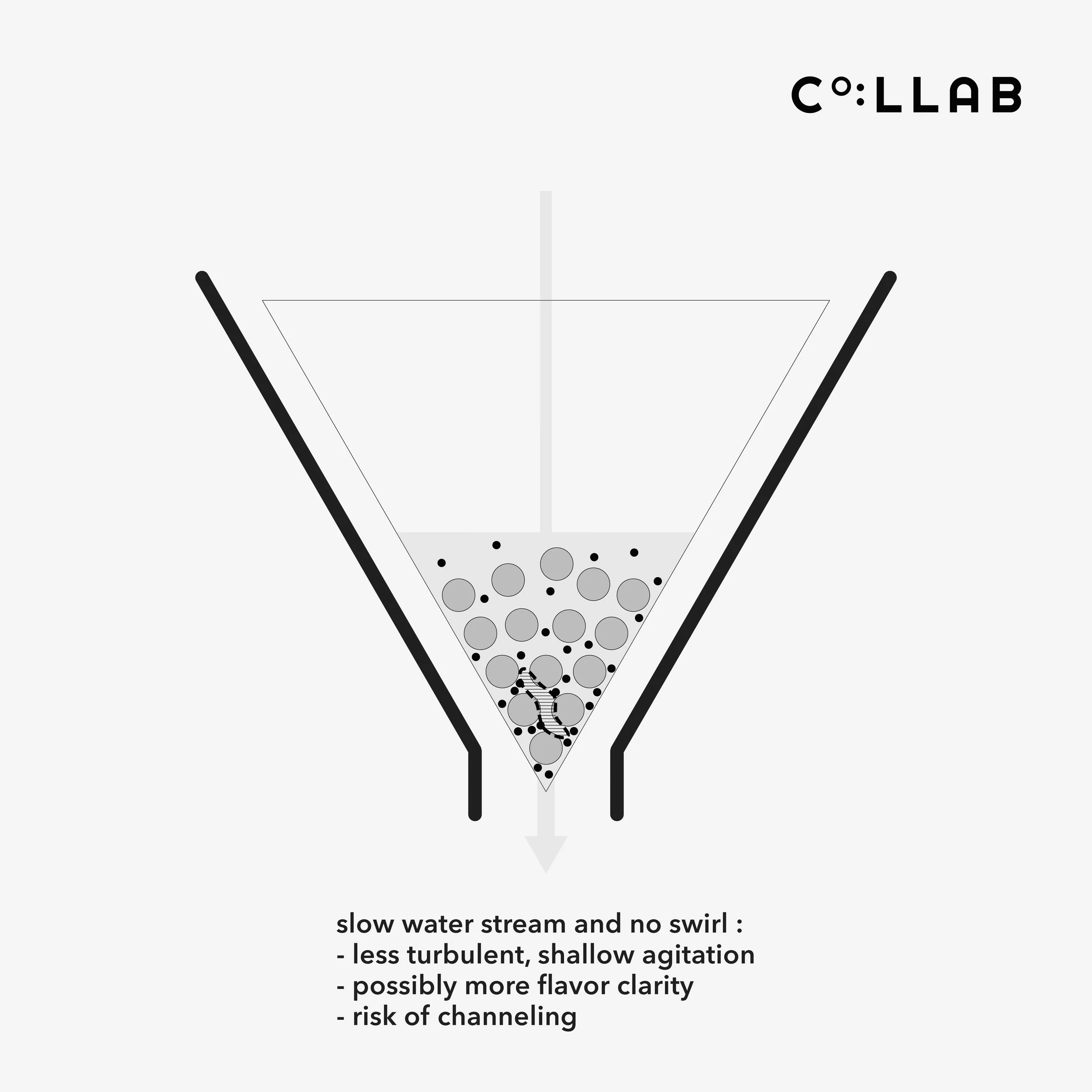 In comparison, slower water stream or pulse pouring can have turbulence under control. Shallower agitation mitigates filter clogging while the evenness of extraction may be sacrificed if channeling happens. A gentle swirl can help curing channels and is recommended after each pour interval.